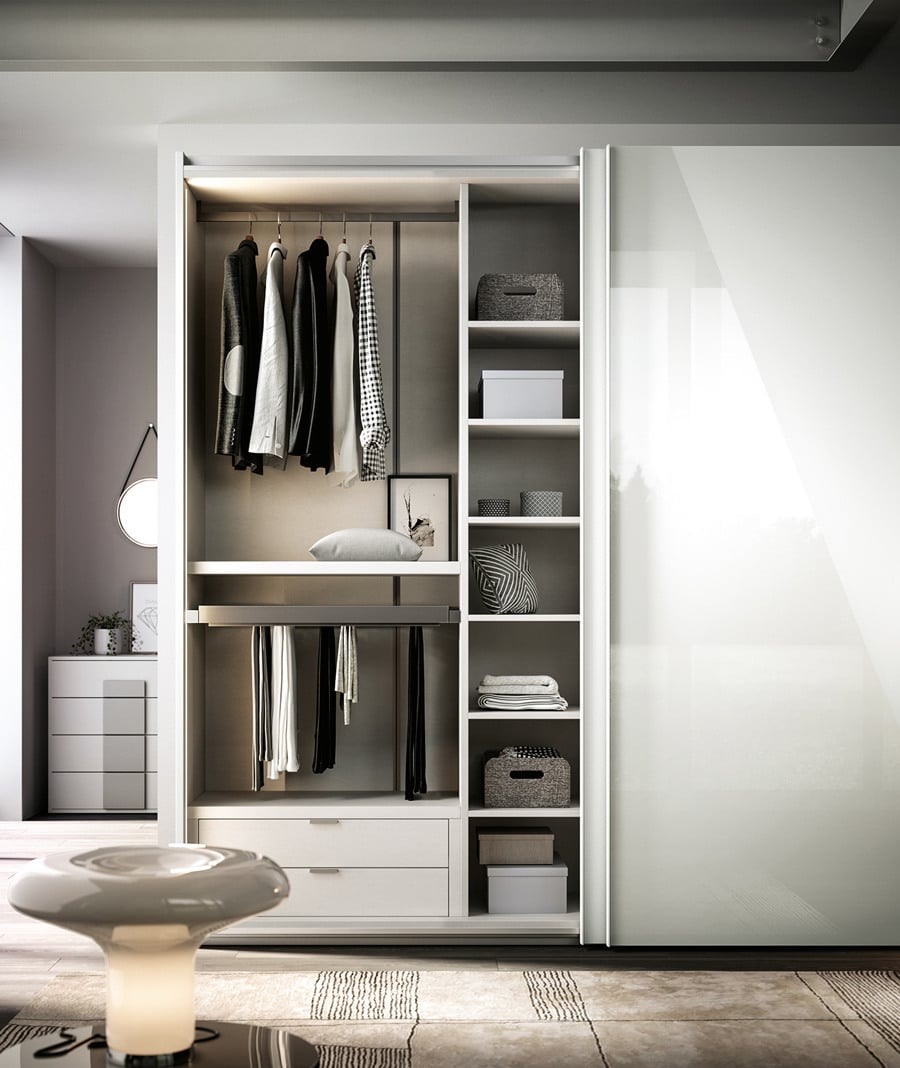 Una delle opzioni da considerare è un armadio a tutta altezza, che sfrutta lo spazio verticale per massimizzare la capacità contenitiva. Sono poi senz’altro da prediligere armadi con ante scorrevoli che non richiedono spazio aggiuntivo per l'apertura delle ante.