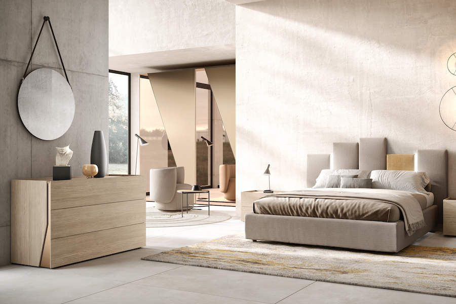 Grande protagonista della camera, la testata del letto Puzzle con pannelli imbottiti, che possono essere disposti in modo personalizzato e utilizzati per creare contrasti visivi, abbinando diverse altezze e tonalità differenti.